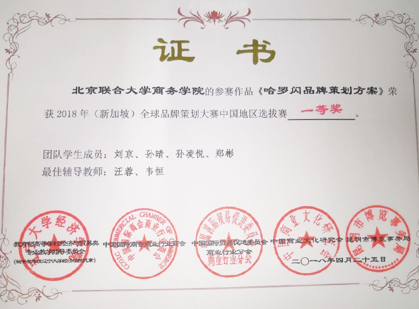 4 月 25 日哈羅閃與北京聯(lián)合大學商務學院的參賽同學們在創(chuàng)意的海洋中角逐,一路過關斬將,在全球品牌策劃大賽中(中國賽區(qū))榮獲了三大獎項。